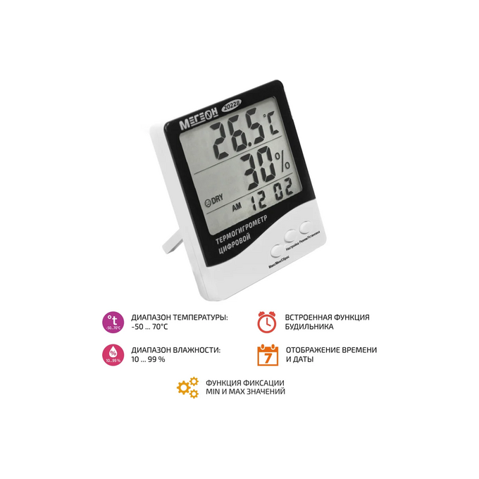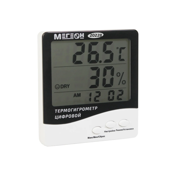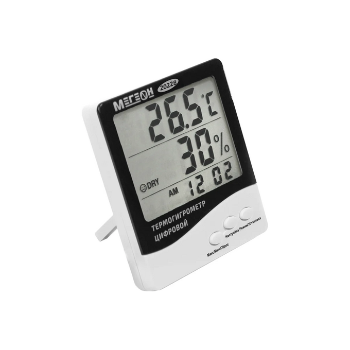 Цифровой термогигрометр МЕГЕОН 20228 - прибор для измерения температуры и влажности в помещении. Прибор внесен в ГРСИ по номером 89786-23 и имеет простой интерфейс и понятные настройки, а также оснащен большим высококонтрастным жидкокристаллическим дисплеем, на котором одновременно отображаются и измеренные температура и влажность, а также текущее время. Благодаря современному эргономичному дизайну термогигрометр идеально впишется в интерьер любого дома, а функция фиксации минимального и максимального значений температуры будет полезной при использовании прибора в загородных домах, банях и складских помещениях. Для отображения данных температуры доступно две единицы измерения: °C и °F. Измеритель также успешно заменит настольные часы и станет незаменимым помощником, способным заменить три отдельно взятых изделия: термометр, гигрометр и будильник.