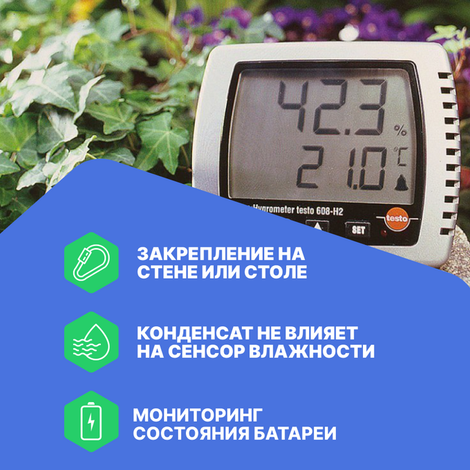 Термогигрометр Testo 608-H1 с поверкой 0560 6081П осуществляет непрерывное измерение влажности, температуры и температуры точки росы.