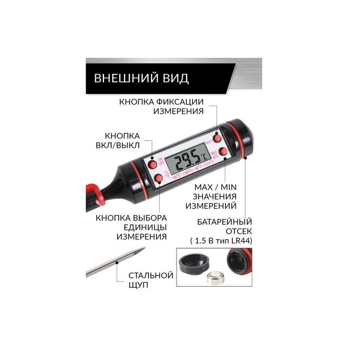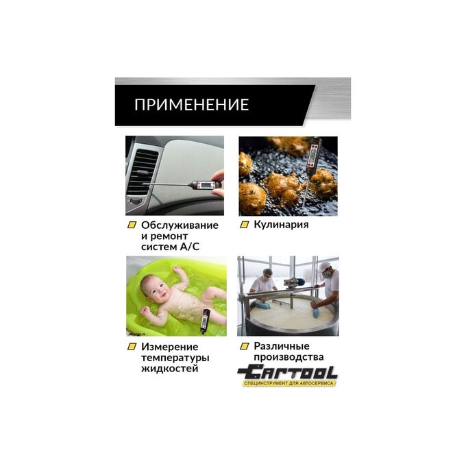 Цифровой термометр применяется для измерения температуры в салоне автомобиля, для проверки для качества работы системы кондиционирования воздуха, а также может применяет везде где требуется произвести замер температуры. В быту при тепловой обработке пищи. В производстве при поддержании необходимой температуры в производственных циклах. В сельском хозяйстве и пр. Прибор выполнен из качественного ABC пластика. Щуп изготовлен из нержавеющей стали.