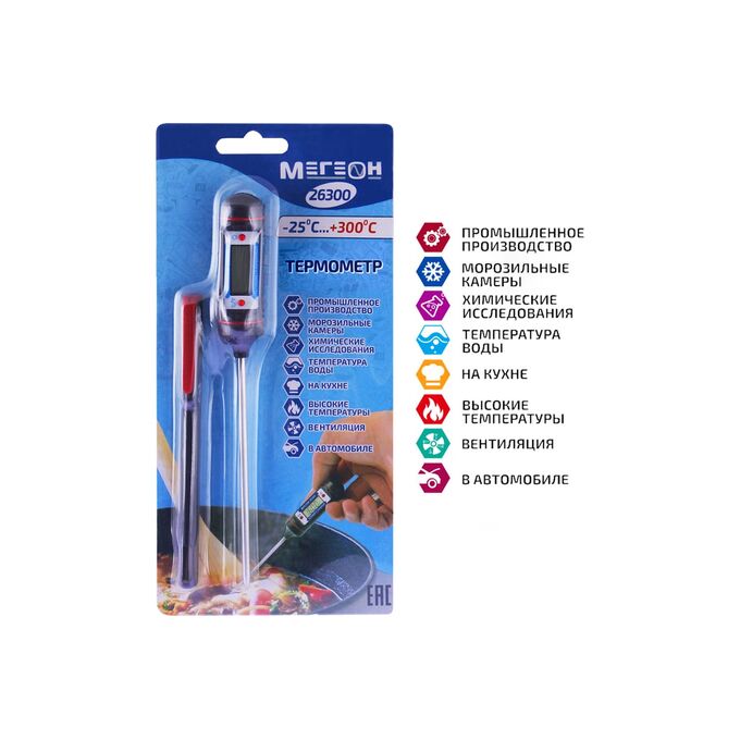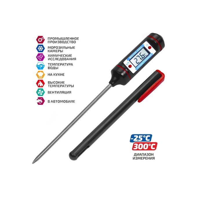 Термометр используется для измерения температуры в диапазоне от -50 до +300 градусов с точностью до ±1°С. Область применения - лаборатории, сельское хозяйство, отопления и вентиляция, пищевые продукты и т.д. Зонд прибора изготовлен из нержавеющей стали, благодаря чему отличается износостойкостью и долговечностью. В случае выхода зонда из строя срабатывает оповещение. Результаты измерений выводятся на ЖК-дисплей.