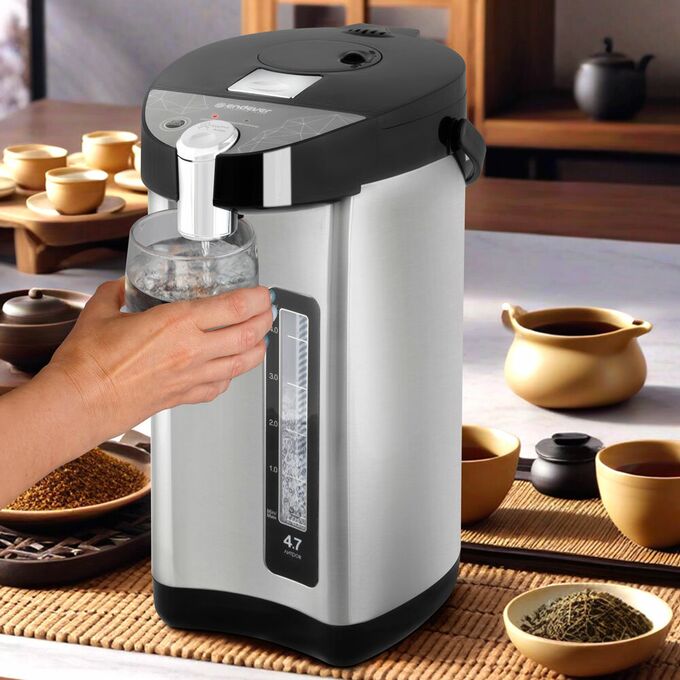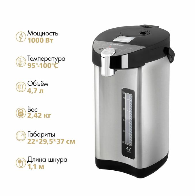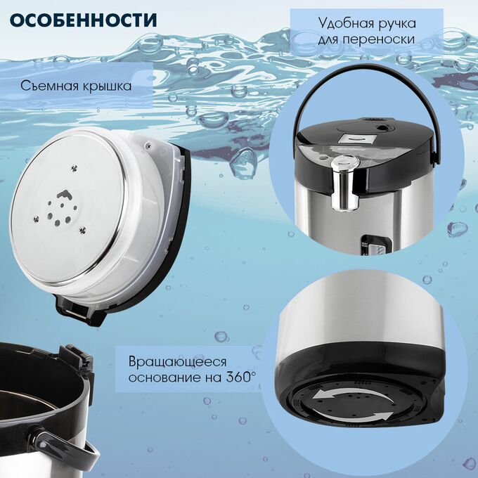 3 способа розлива воды: касанием кружки кнопки у носика, нажатием кнопки на панели, нажатием помпы на крышке, Температура нагрева воды: 95-100°C, Функция поддержания температуры, Функция повторного кипячения, Индикатор уровня воды, Блокировка включения без воды и блокировка крышки, Материал колбы: нержавеющая сталь, Тип нагревательного элемента: открытый, Съемная крышка, Вращение на основании на 360°, Удобная ручка для переноски