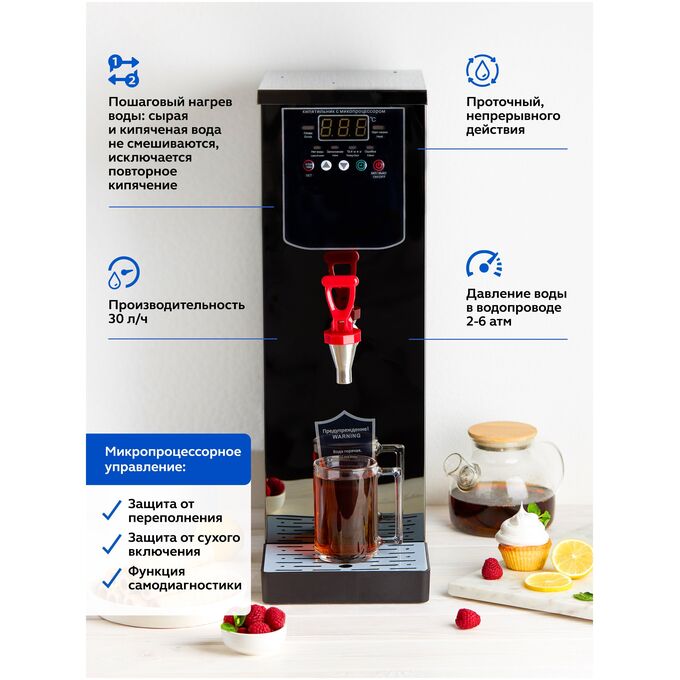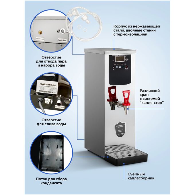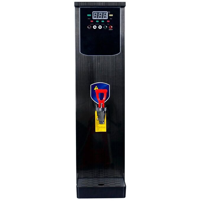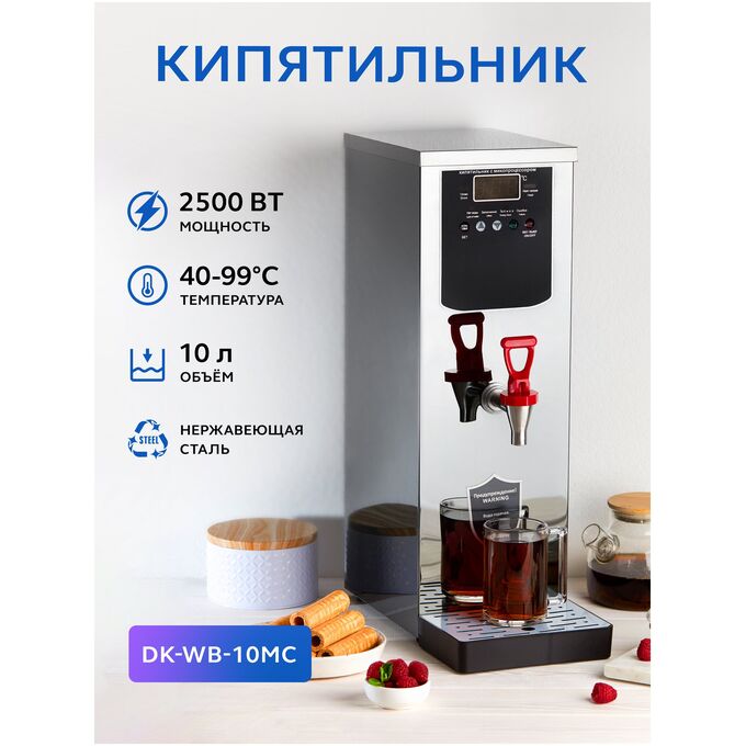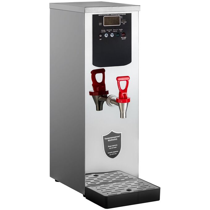 Кипятильник электрический большой непрерывного действия DK-WB-10MC – это техника для профессиональной кухни, которая требует подключения не только к электросети, но и к водопроводу, и позволяет персоналу и посетителям кафе, ресторанов, школ, больниц, офисов и прочих общественных учреждений непрерывно разливать кипяток, не заботясь об уровне воды в резервуаре. Электрокипятильник проточный работает по инновационной технологии пошагового, или послойного нагрева воды, контролируемого микропроцессором. ТЭН электрооборудования греет не всю воду в резервуаре, а лишь небольшой ее слой, который можно сразу же сливать и использовать. Это позволяет избежать смешивания сырой и кипяченой воды, как в проточных кипятильниках с поплавковым клапаном, повышает скорость кипячения и производительность оборудования втрое по сравнению с кипятильниками наливного типа. Производительность кипятильника DK-WB-10MC, резервуар которого имеет объем 10 л, такая же, как у заливного кипятильника объемом 30 л. Микропроцессорное управление позволяет регулировать температуру воды с высокой точностью и в широком диапазоне (40-99оС) и обеспечивает только одно закипание, помогая избежать многократного кипячения. Режим работы может быть задан как круглосуточный, так и со включением и выключением в определенное время для каждого дня недели. Устройство обеспечивает автоматический контроль за уровнем и температурой воды, имеет защиту от сухого хода, от переполнения и функцию самодиагностики, которая позволяет своевременно выявлять неполадки в работе. Розлив воды осуществляется через металлический кран с пластмассовым рычагом. Корпус электрокипятильника изготовлен из нержавеющей стали. Компактные размеры позволяют размещать его в помещениях ограниченной площади, проходах и коридорах. В комплект кипятильника входит вместительный каплесборник.
