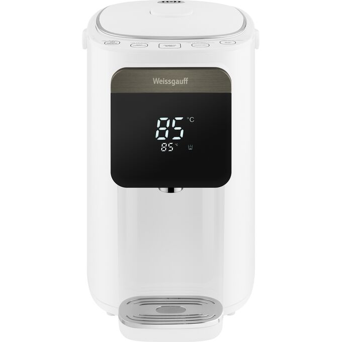 Вместительный и функциональный накопительный термопот от Weissgauff, выполненный в белом цвете, обладает баком для воды объемом 5 литров, возможностью поддержания требуемой температуры в диапазоне от 45 до 95 °C, а также 6 уровнями регулировки нагрева, функциями повторного кипячения, быстрой очистки и приготовления щелочной воды.
