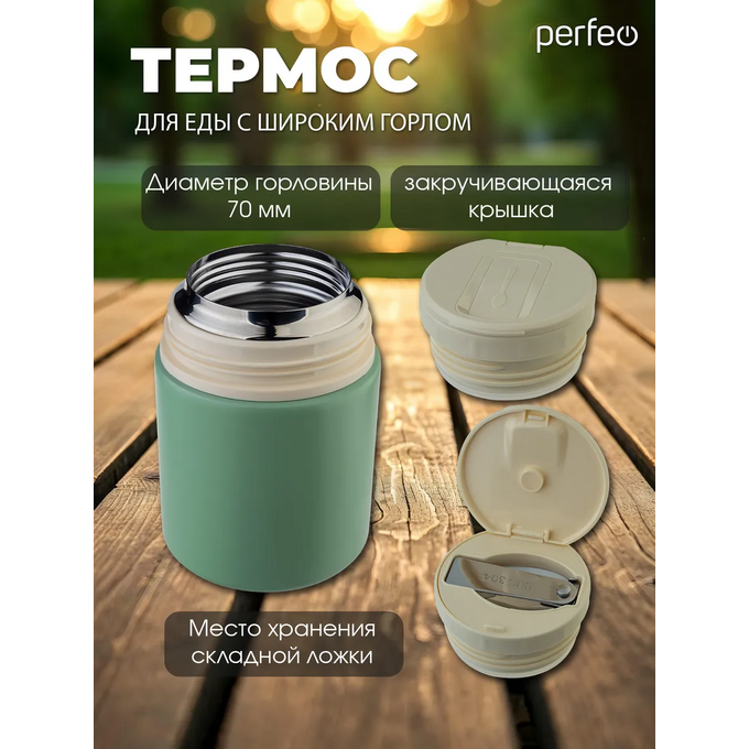 Термос для еды PERFEO с широким горлом, ручкой, ложкой, объем 0,6 л., оливковый, (Арт. PF_E2320)