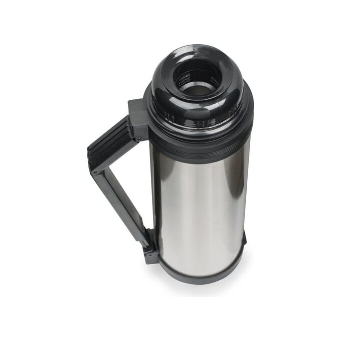 Термос диаметром 10,5 см и высотой 33 см выполнен в серебристом цвете.