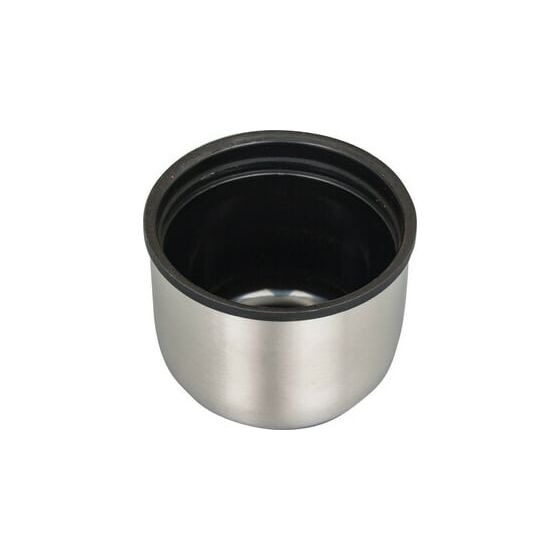Термос диаметром 8 см и высотой 33 см выполнен в серебристом цвете. Оснащен специальной кнопкой, позволяющей наливать напитки, не отвинчивая пробку.