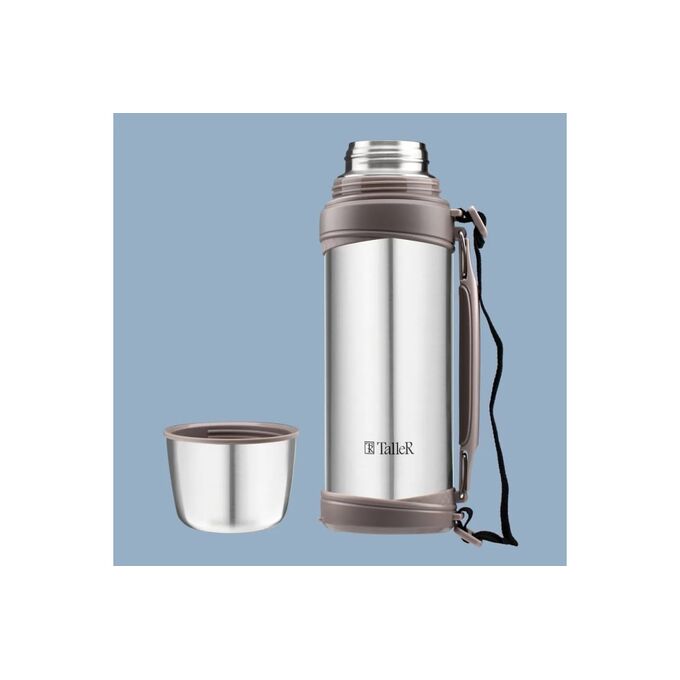 Колба термоса изготовлена из высококачественной нержавеющей стали марки 18/10 (AISI 304). Матовая полировка. Винтовая пробка, кнопочный механизм, узкое горлышко. Завинчивающаяся крышка-кружка. Термос снабжен удобной компактной ручкой и ремешком для переноски. Цвет пластиковых элементов (PP) - светло-коричневый.