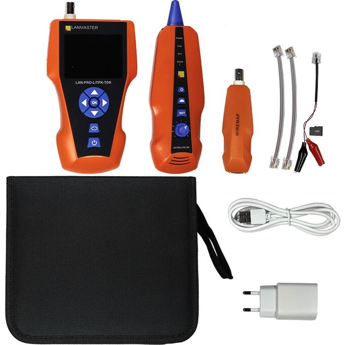 Главный блок, индуктивный щуп, ответная часть, USB micro шнур, зарядное устройство, кабель RJ45 - RJ45, кабель RJ11 - RJ11, кабель RJ11 - крокодилы, сумка-чехол на ремне, карта памяти, инструкция по эксплуатации.