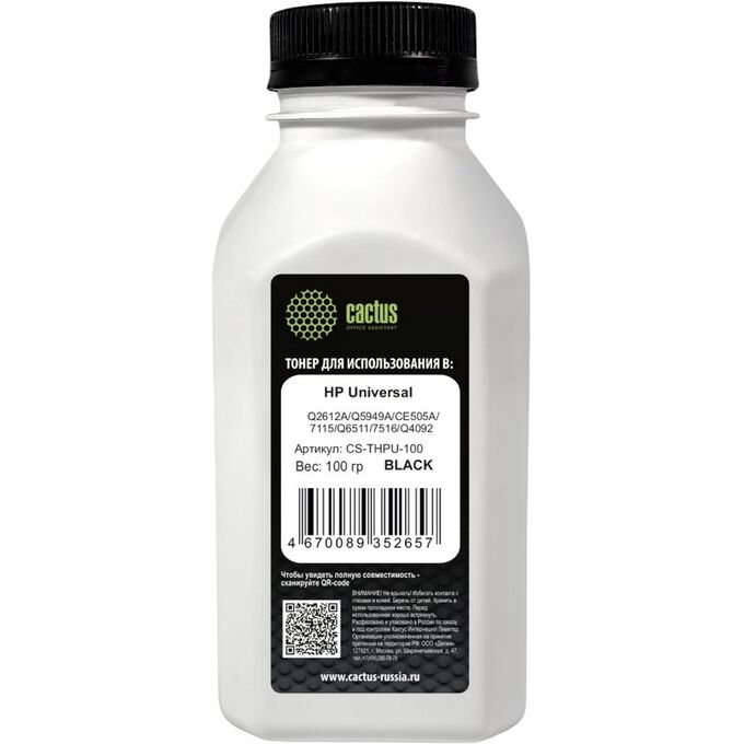 Тонер Cactus CS-THPU-100 черный флакон 100гр для принтера HP Universal Q2612A/Q5949A/CE505A/7115/Q6511/7516/Q4092