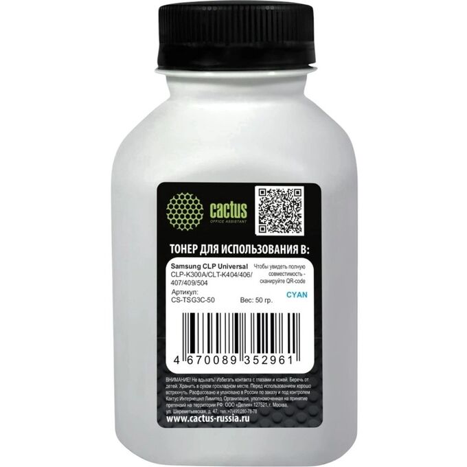 Тонер Cactus CS-TSG3C-50 голубой флакон 50гр для принтера Samsung CLP Universal CLP-K300A/CLT-K404/406/407/409/504