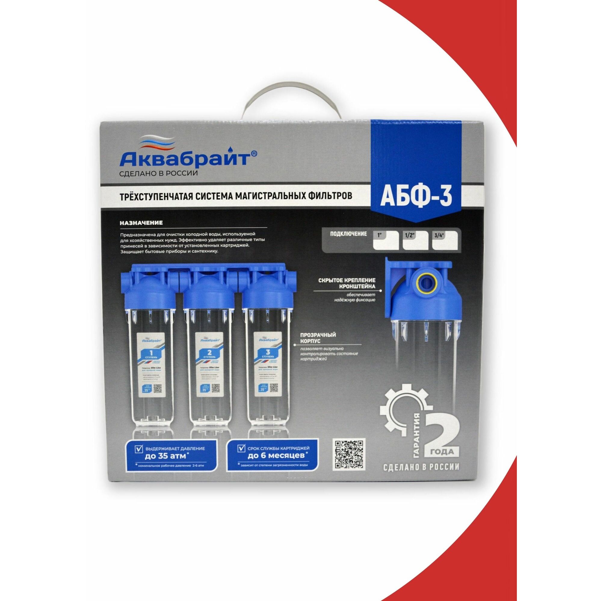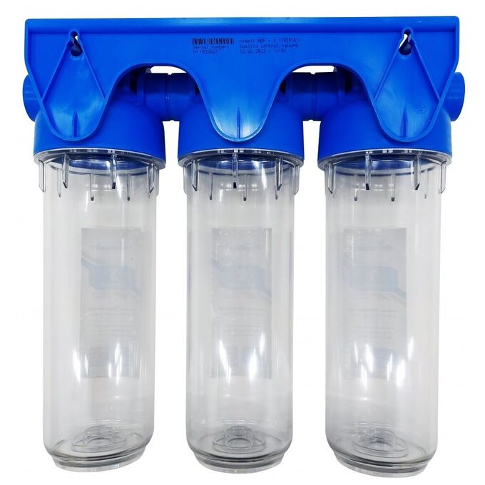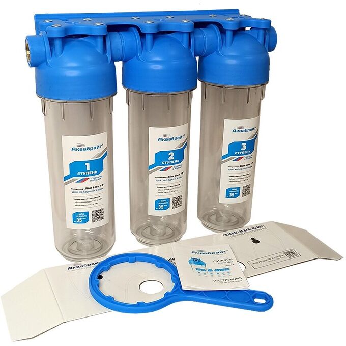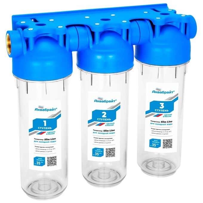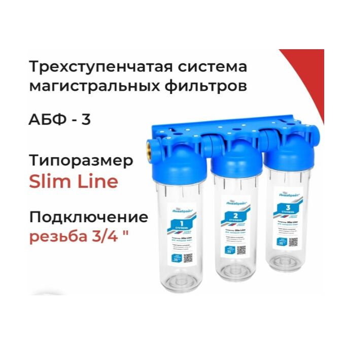 Трехступенчатый магистральный фильтр АКВАБРАЙТ АБФ-3 3/4, стандарт SLIM LINE. Прозрачные корпуса. Рабочее давление от 2 до 6 атм.