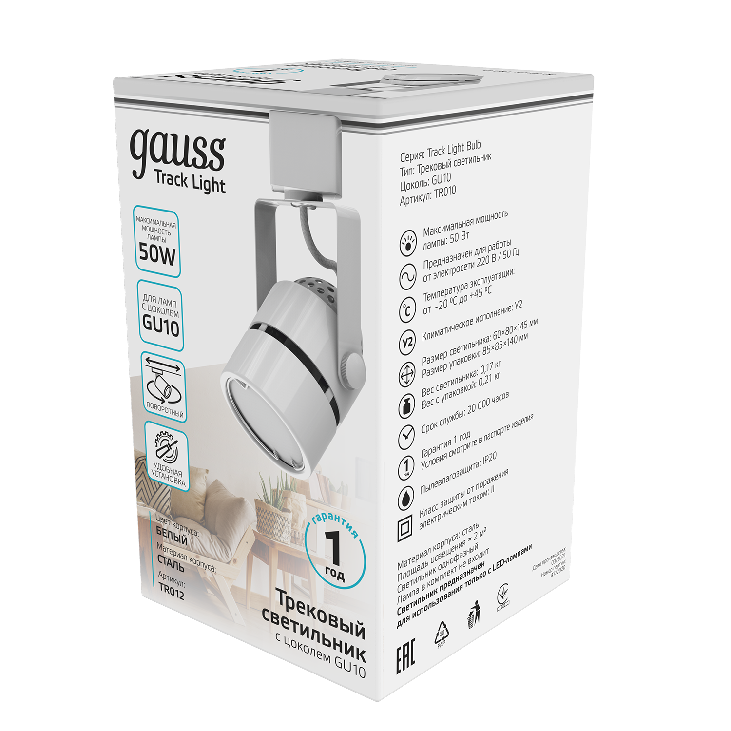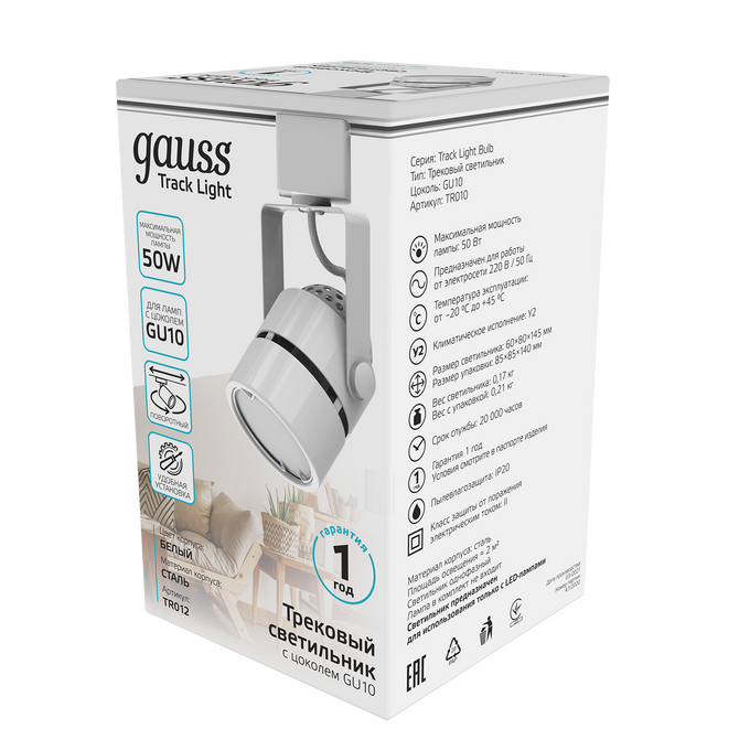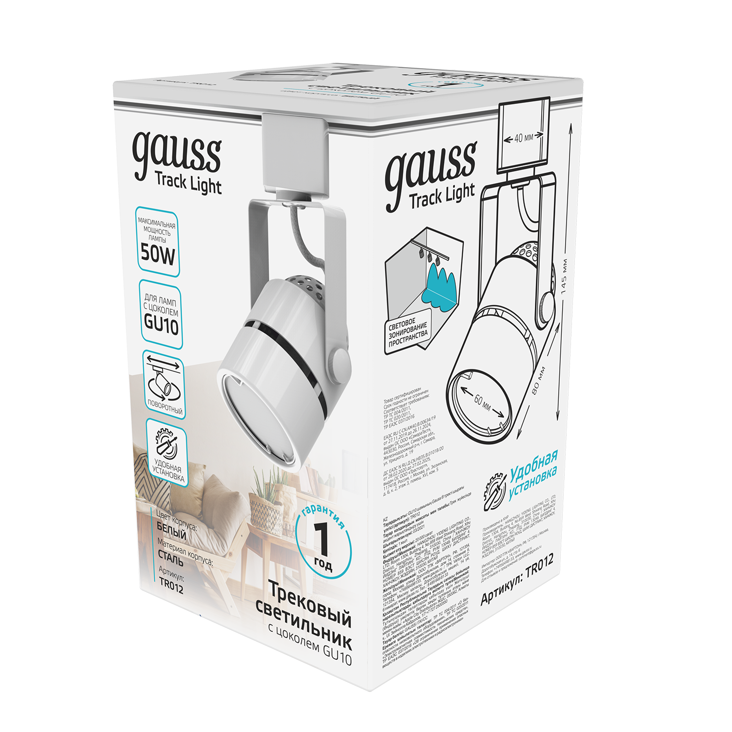 Светильник трековый Gauss цилиндр GU10 TR012 позволяет использовать лампы мощностью до 50w, что значительно расширяет возможности его целевого использования. Цвет корпуса белый. Спот состоит из разбираемого стального корпуса, зеркального рефлектора и матированного рассеивателя. Поворотная способность позволяет создавать световой акцент в любой точке пространства комнаты или коммерческого помещения. Цветопередача зависит от используемой лампы. Включается в систему Track Lights LED от Gauss. Угол светового излучения 41-80°.