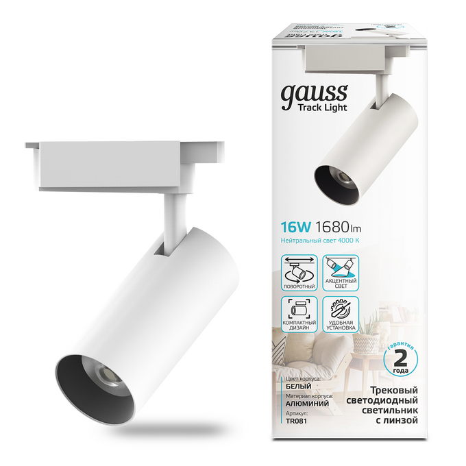 Светильник трековый Gauss цилиндр 16W TR081 совместим с трек-системой Gauss и может быть использован как отдельный элемент, так и в комплексе с другими спотами. Имеет широкие возможности регулировки в горизонтальных и вертикальных плоскостях. У него лаконичный дизайн, прочный компактный корпус из легкого алюминия. Угол светового пучка 36°, яркость потока 1680лм, свет белый нейтральный 4000 (не искажает цвета освещаемых предметов) Отлично работает в качестве интерьерного, акцентного освещения в жилых помещениях а так же в коммерческих для освещения витрин, барных стоек, примерочных.