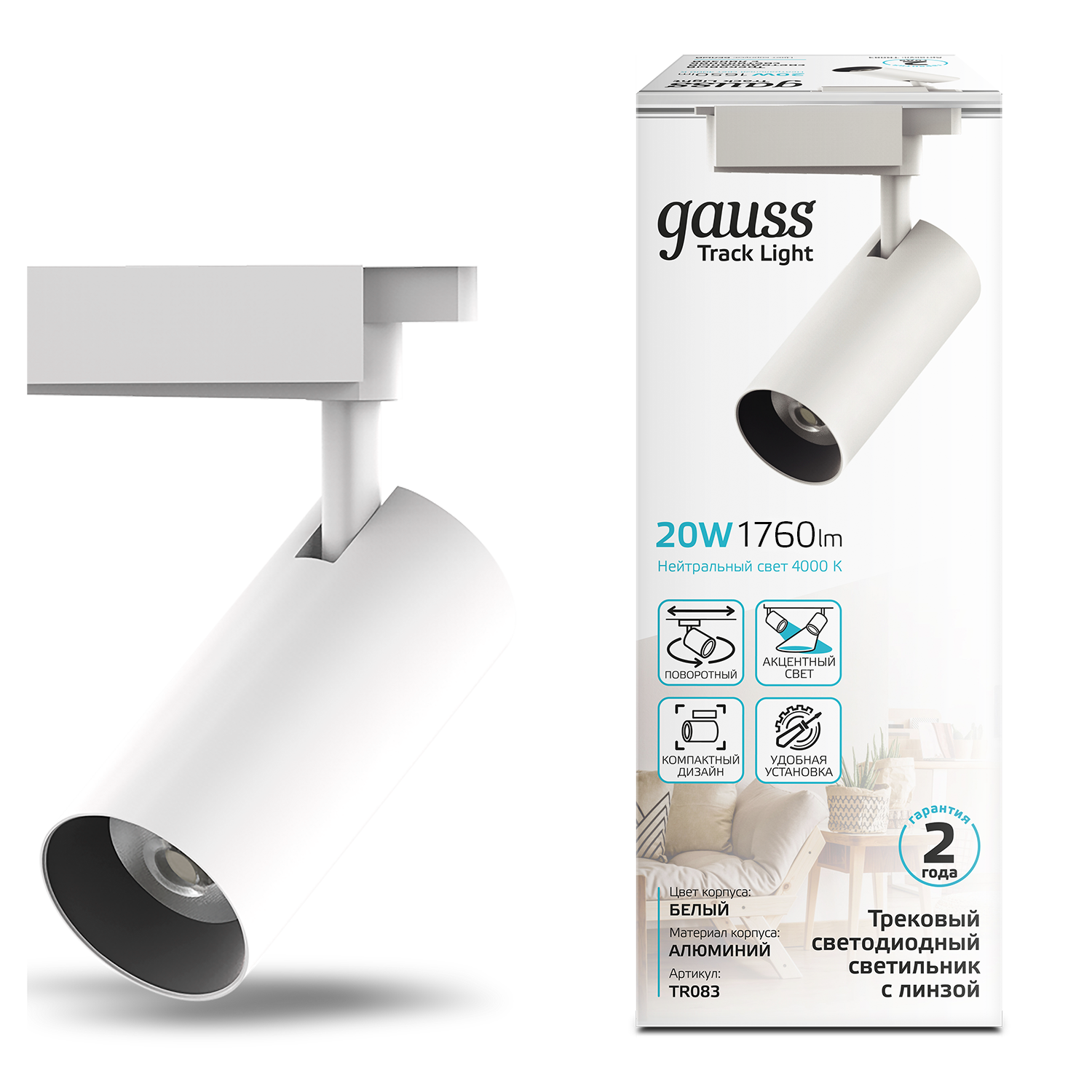 Светильник трековый Gauss цилиндр 20W TR083 - компактный поворотный спот, предназначенный для акцентного освещения зон и предметов: картины, ниши, части интерьера требующие отдельного светового сценария. В комплексных трек-системах Gauss может выступать в роли основного освещения для минималистичных интерьеров и комнат с низкими потолками. Цвет белый, материал корпуса алюминий, материал линзы - сатиновое стекло. Внутри корпуса зеркальный рефлектор. У спота яркий направленный луч 36° 1760лм.
