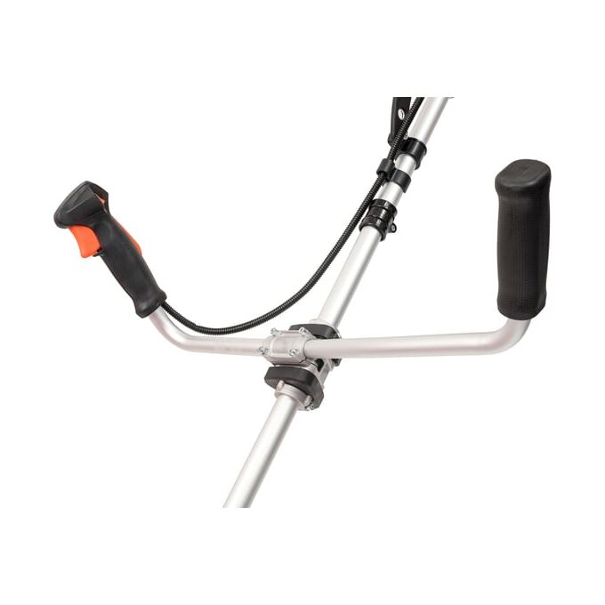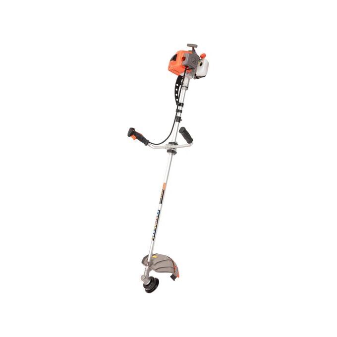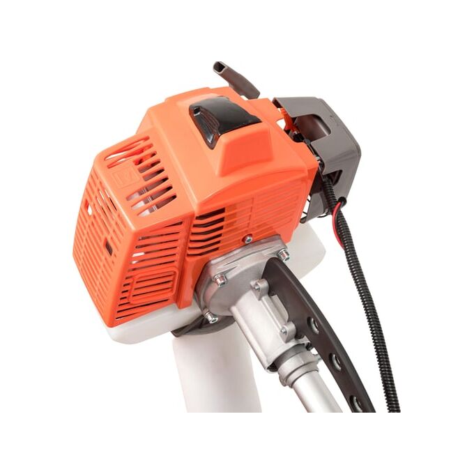 Оснащенный мощным двухтактным двигателем объемом 63 см³, он обеспечивает высокую производительность и надежность в работе. Верхнее расположение двигателя способствует удобству эксплуатации и снижению вибрации. Прямой приводной вал гарантирует эффективную передачу мощности, а U-образная велосипедная ручка обеспечивает комфортное управление. Режущие элементы в виде лески и диска позволяют адаптировать триммер под различные задачи.