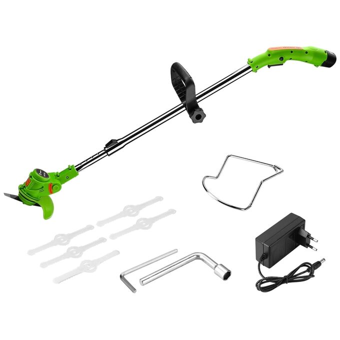 1 шт триммер; 1 шт аккумулятор; 1 шт зарядное устройство; 5 шт пластиковые лезвия; 1 шт металлическое лезвие; 1 шт шестигранный ключ; 1 шт торцевой ключ с внутренним шестигранником; 1 шт рукоятка 1 шт скоба