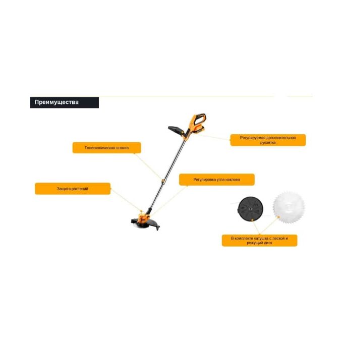 Триммер садовый аккумуляторный DEKO DKTR2 Max 1*3.0Ач - компактная аккумуляторная триммер модель, удобная для скашивания травы в труднодоступных местах, вдоль заборов, клумб, подравнивания газонов, краев садовых дорожек.
