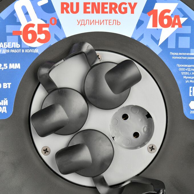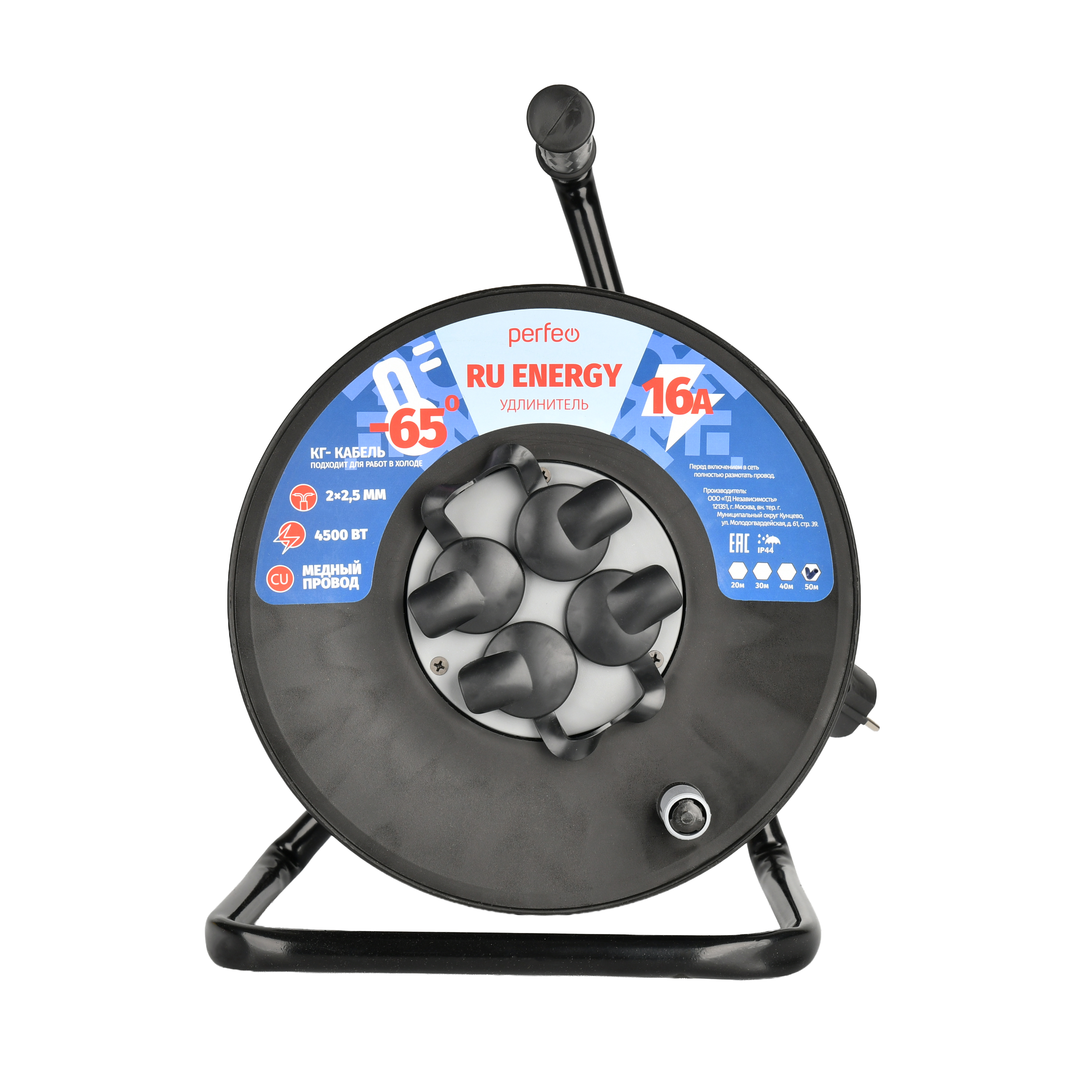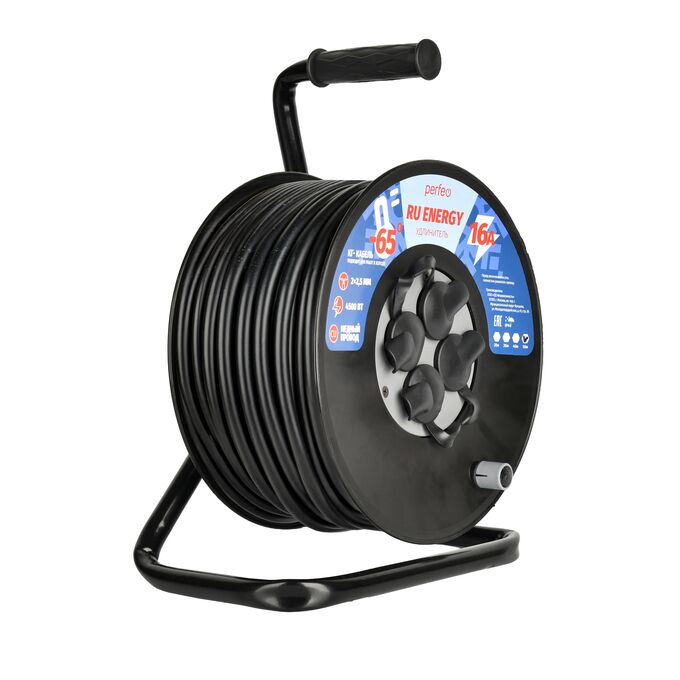 Удлинитель на катушке без заземления Perfeo "RU ENERGY" 50м 4гн 16А КГ 2х2,5 IP44 черный, (Арт. PF_E2545)