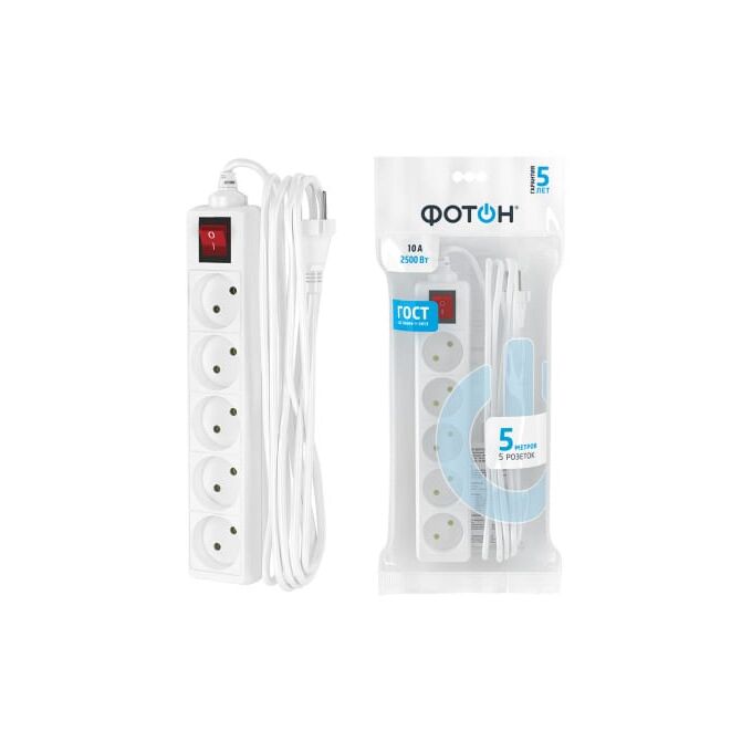 Удлинитель сетевой ФОТОН 21206 10-55S, 5м, 5 розеток, 10А, с выключателем, белый