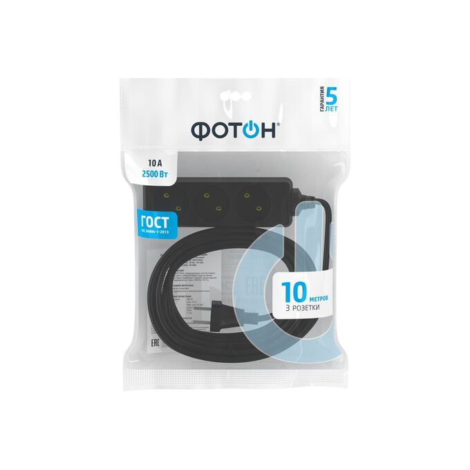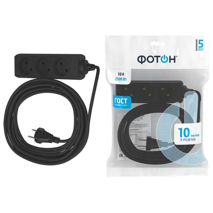 Технические характеристики ФОТОН 10-103 10м, 3 розетки, 10А, Черный 22721