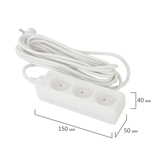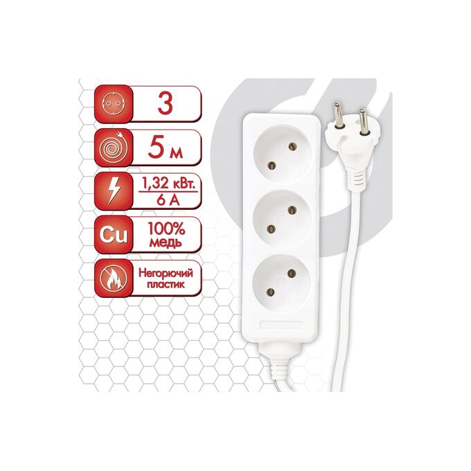 Удлинитель сетевой SONNEN U-135 (511430) 3 розетки, без заземления, 6А, 5м, белый