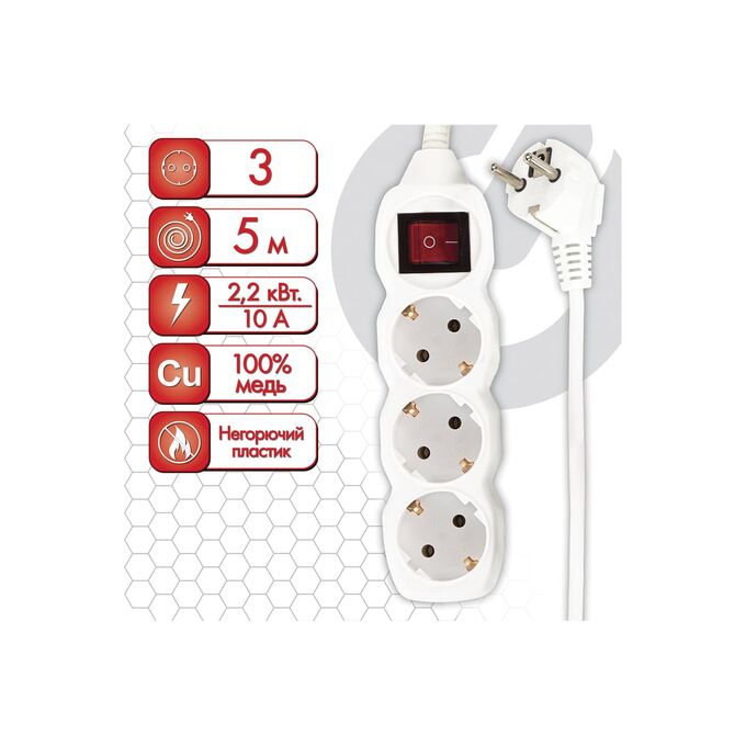 Оснащен прочным корпусом из высококачественного, ударопрочного, негорючего пластика белого цвета. Кабель 5-метровый, 3-х жильный с заземлением и евровилкой. Сечение провода - 3х0,75 мм. Корпус включает 3 евророзетки. Пиковая нагрузка - 2200 Вт. Устройство оснащено удобным выключателем с подсветкой. Степень защиты IP20.