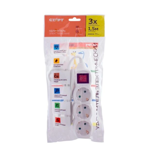 Удлинитель СТАРТ 4607175852692 3 розетки С/У S 3x1-ZDV с заземлением и защитой от детей сечение провода 3х0,75мм2, длина провода 1,5м