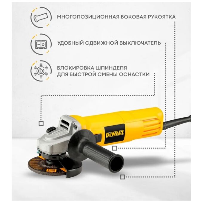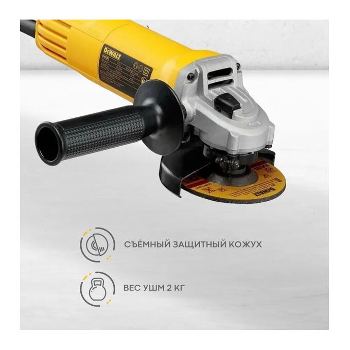угловая шлифовальная машина DeWalt DWE4117-QS, защитный кожух, боковая рукоятка, спецключ, документация, коробка.