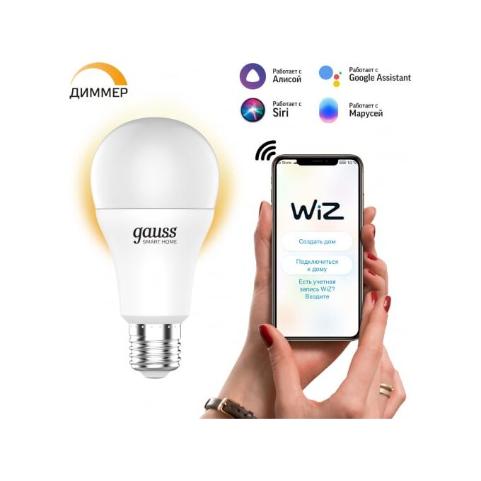 Умная Wi-fi лампочка Gauss, Smart Light DIM E27 А60 10 Вт 2700K, диммируемая, управление голосом/смартфоном 1070112:
