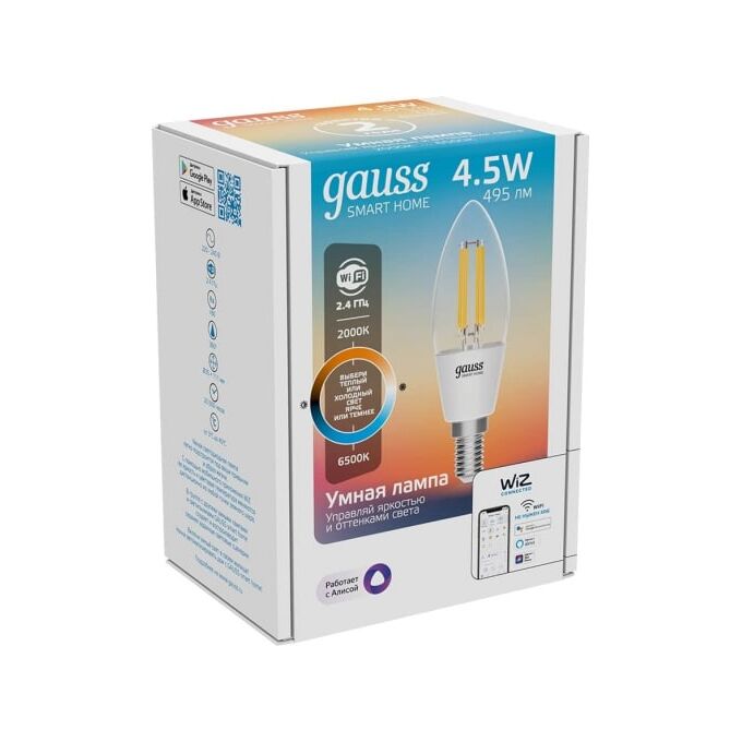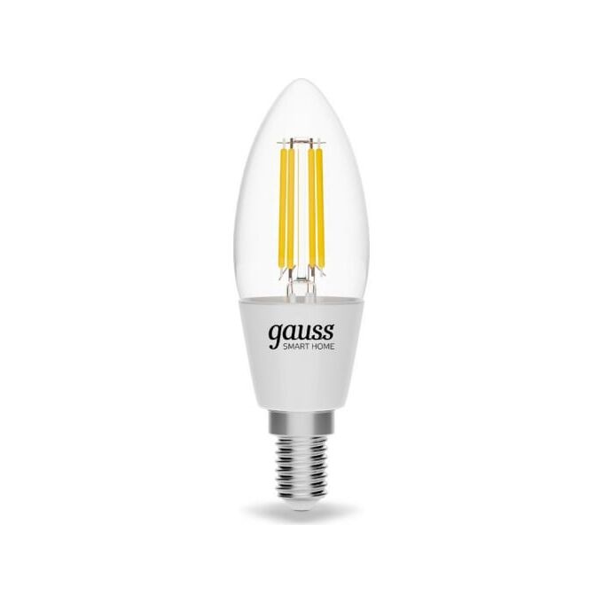 Умная Wi-fi филаментная лампочка Gauss, Smart Light ССТ DIM E14 C37 4,5 Вт 2700-6500K, диммируемая с изменением температуры, управление голосом/смартфоном 1250112: