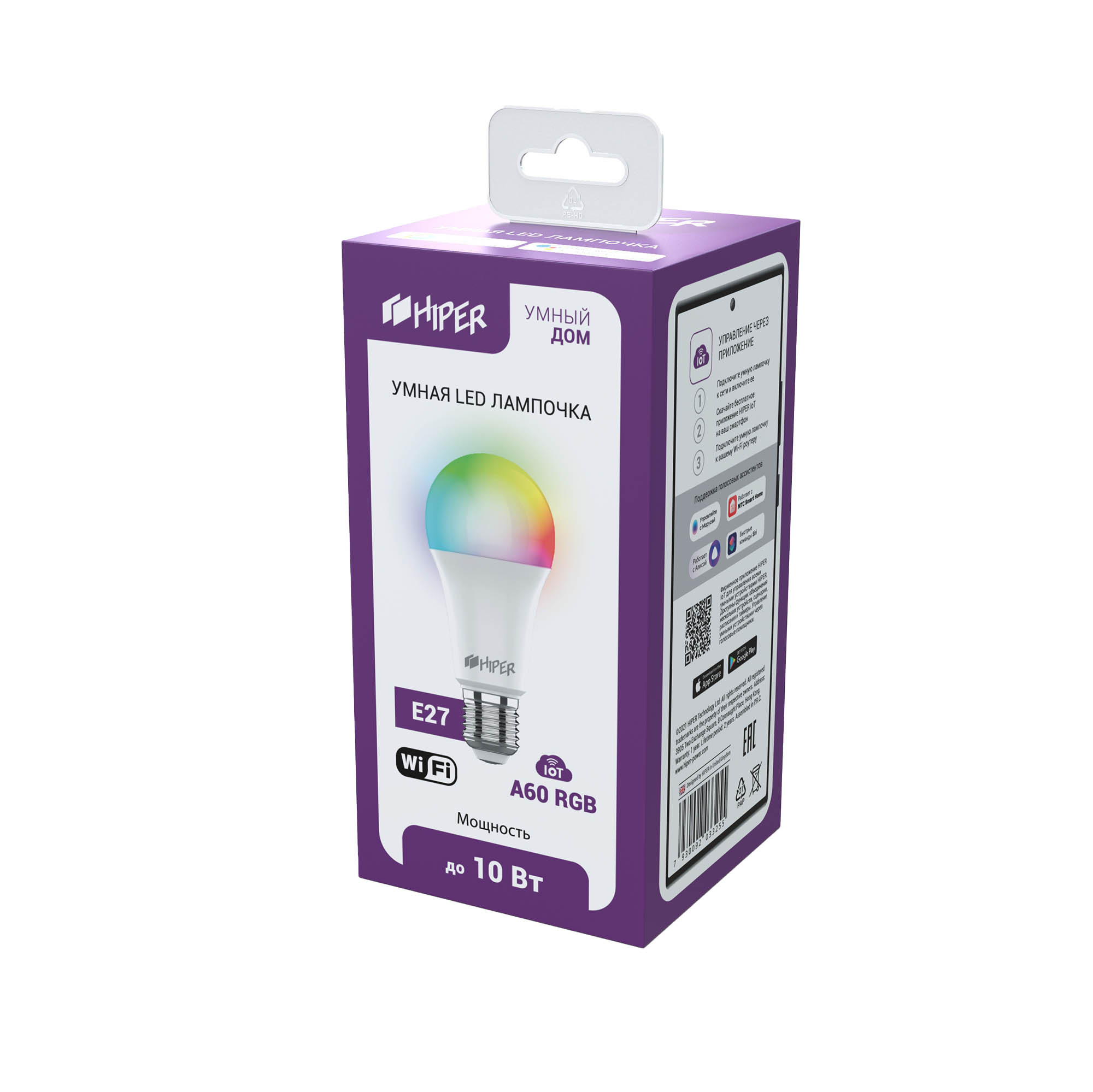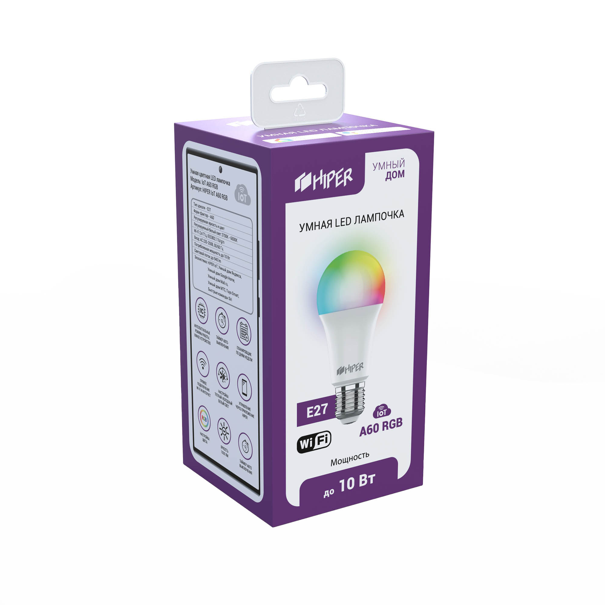 Умная лампа HIPER (Iot A60 RGB) E27 RGB 10Вт 1020lm Wi-Fi (1шт)