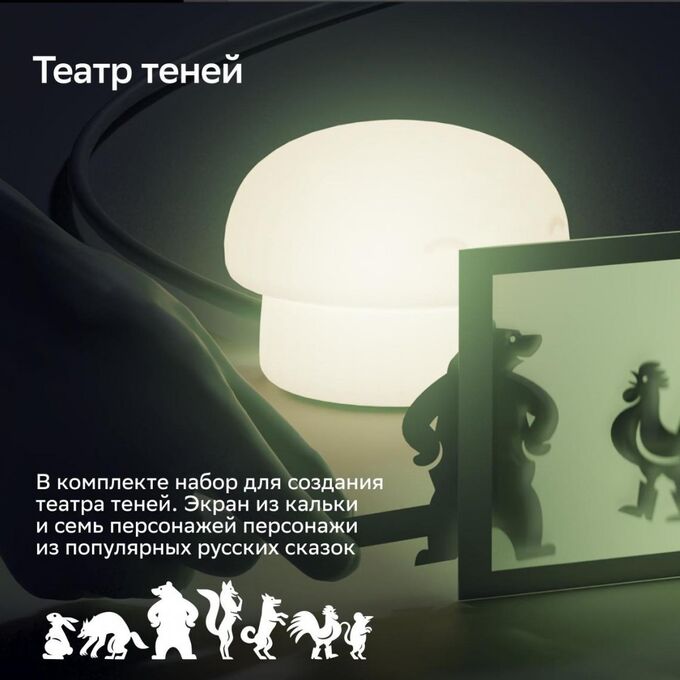 Управление со смартфона. Создает атмосферу. Театр теней в комплекте. Дополняет интерьер детской. Голосовой помощник Салют.
