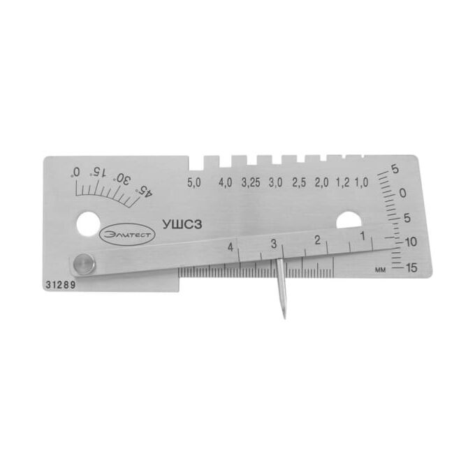 Универсальный шаблон сварщика УШС-3 (альтернативное название — универсальный шаблон сварщика УШС-3М) предназначен для визуального и измерительного контроля стыкуемых деталей, параметров стыкового шва и дефектов. Крупные шкалы шаблона обеспечивают удобство считывания показаний. Острый наконечник измерительного движка шаблона отлично подходит для измерения вогнутости корня стыкового шва и глубины подрезов, а пазы на основании шаблона позволяют оперативно определить диаметр электродов или сварочной проволоки непосредственно на месте проведения работ.