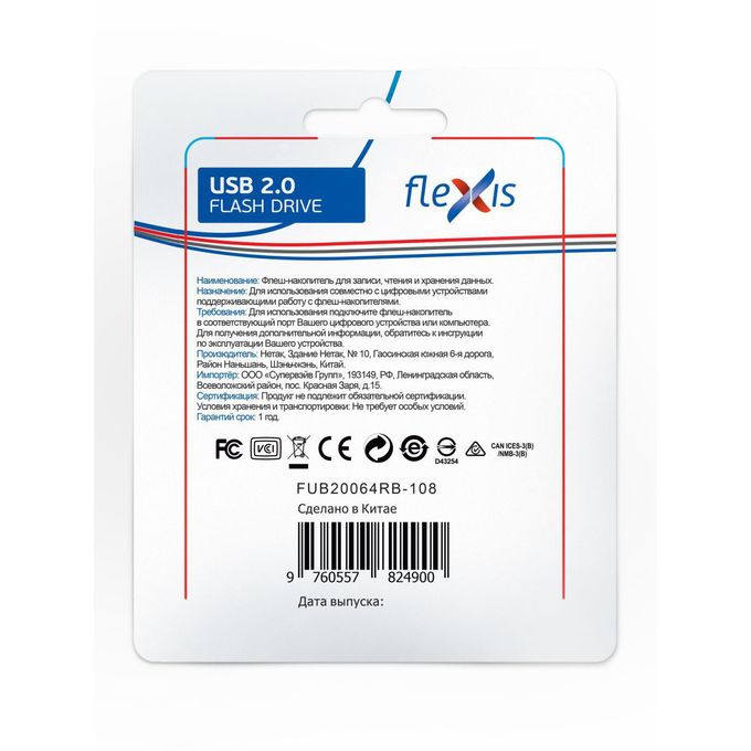 Флэш-драйв Flexis RB-108, 64 Гб, USB 2.0