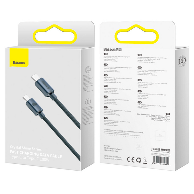 USB-кабель Baseus CAJY000601, 100W. Type-C/Type-C, ткань, 1.2 м, круглый, серый, фирменная упаковка