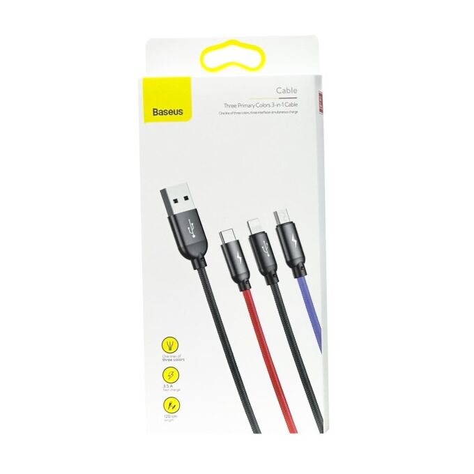 Мульти-кабель Baseus CAMLT-BSY01 - позволяет подключать к зарядному устройству одновременно до 3 устройств с разными интерфейсами. Оснащенный на одном конце входящим коннектором USB Type-A на другом конце данный аксессуар имеет три ветки провода с интерфейсами Lightning, microUSB и Type-C. Поэтому воспользоваться данным аксессуаром для зарядки своих мобильных девайсов могут как владельцы iPhone, так и пользователи гаджетов на Android. Правда пользователям "яблока" производитель данного изделия предоставил также и возможность синхронизации гаджета с компьютером со скоростью передачи данных до 480 Мбит/сек., тогда как по двум другим веткам кабеля возможна только зарядка. Кабель быстро заряжает технику, позволяя пропускать через себя ток с максимальной силой 3.5A, что вполне достойный показатель для мобильной техники. Преимуществом продукции Baseus является забота о безопасности устройств потребителей их продукции.