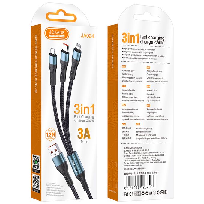 USB кабель JOKADE JA024 3-in-1 Fast Charging Cable 1.2 m black