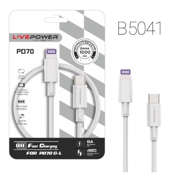 USB-кабель Live-Power PD70 Type-C-L 20W 1000mm White 20шт в упаковке