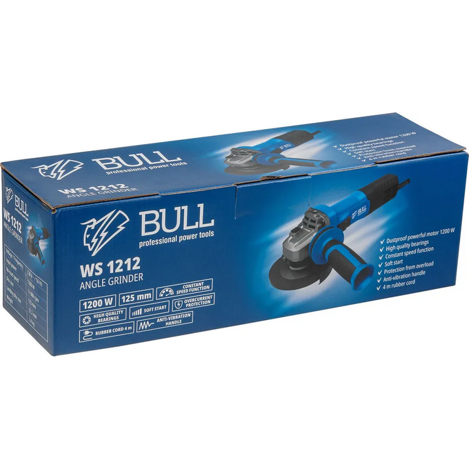 Шлифмашина угловая (болгарка) BULL WS 1212 (1333513) оснащена долговечным и производительным пылезащищенным двигателем 1200 Вт.