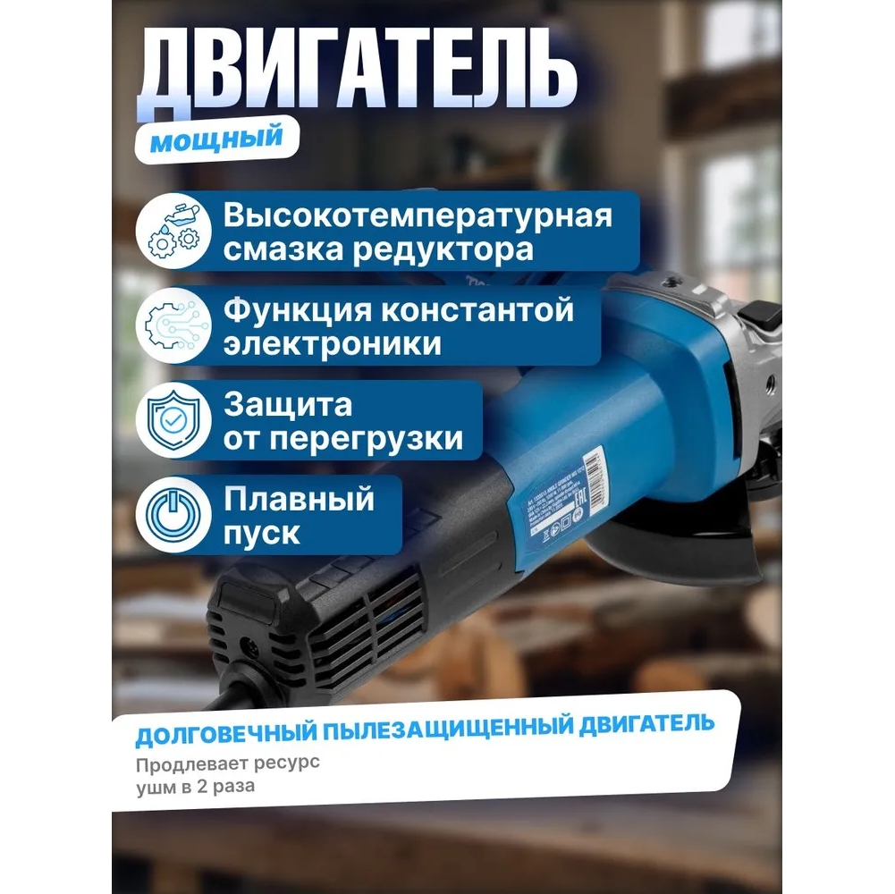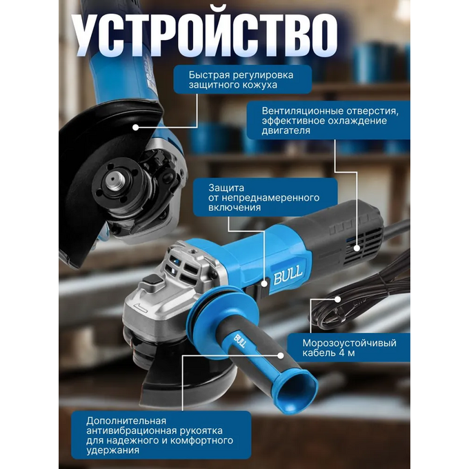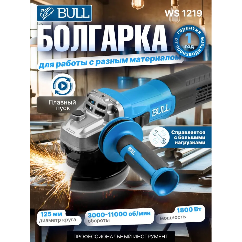 Новая ушм BULL WS 1219 оснащена долговечным и производительным пылезащищенным двигателем 1800 Вт, что делает её одной из самых мощных в своем классе и пригодной для самых тяжелых работ. Регулировка оборотов поможет подобрать необходимую скорость в зависимости от выполняемой работы. Инструмент оснащен защитой от перегрузки, плавным пуском, константной электроникой и защитой от непреднамеренного пуска(при возобновлении подачи тока в сети). Дополнительная антивибрационная рукоятка способствует надежному удержанию инструмента и значительно увеличивает комфорт использования. Наличие морозоустойчивого резинового кабеля 4 м, быстрорегулируемый защитный кожух, шестерни редуктора из высоколегированного сплава, высокотемпературная смазка редуктора - обеспечат максимальную производительность, долгий ресурс и удобство эксплуатации.