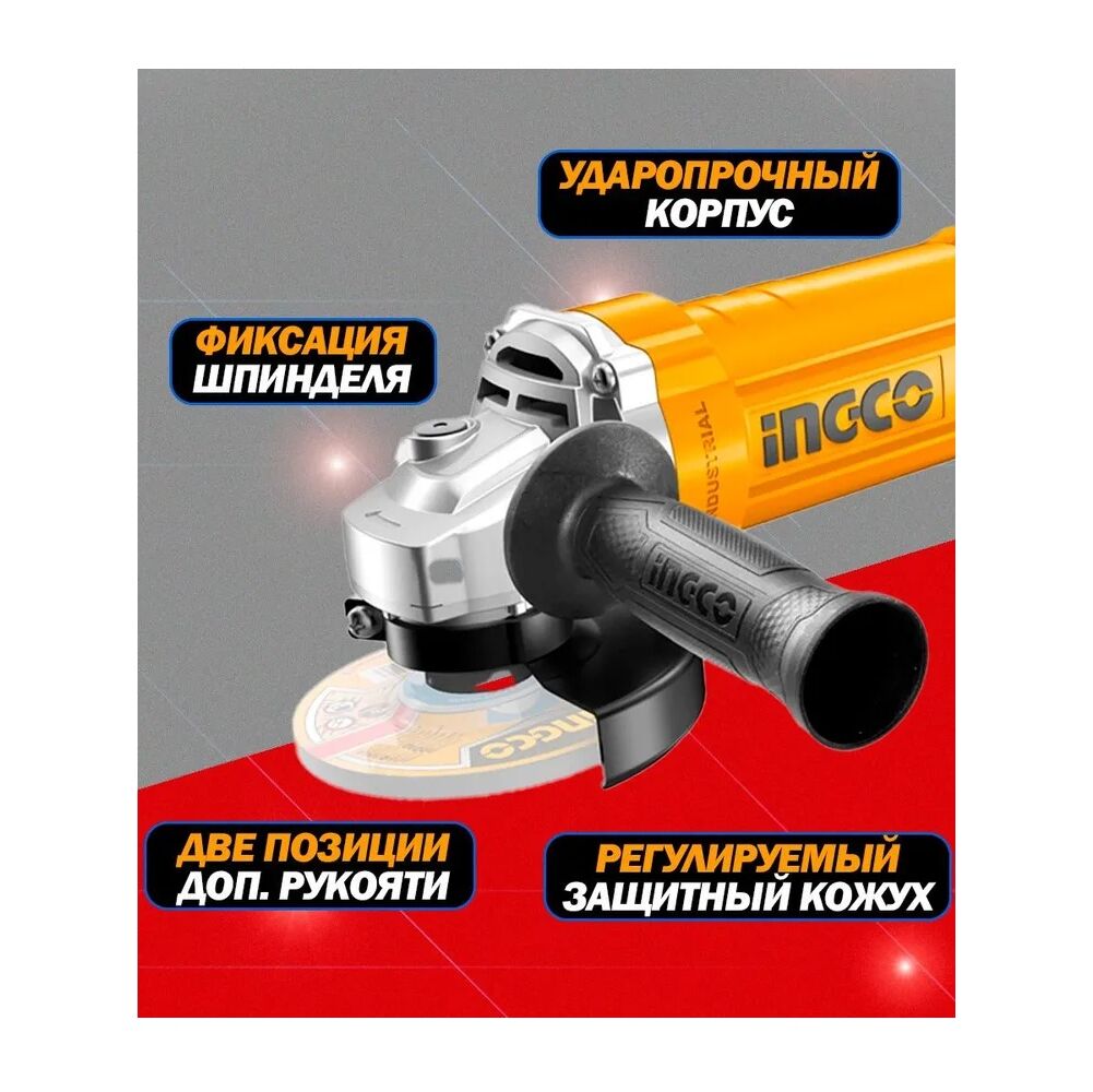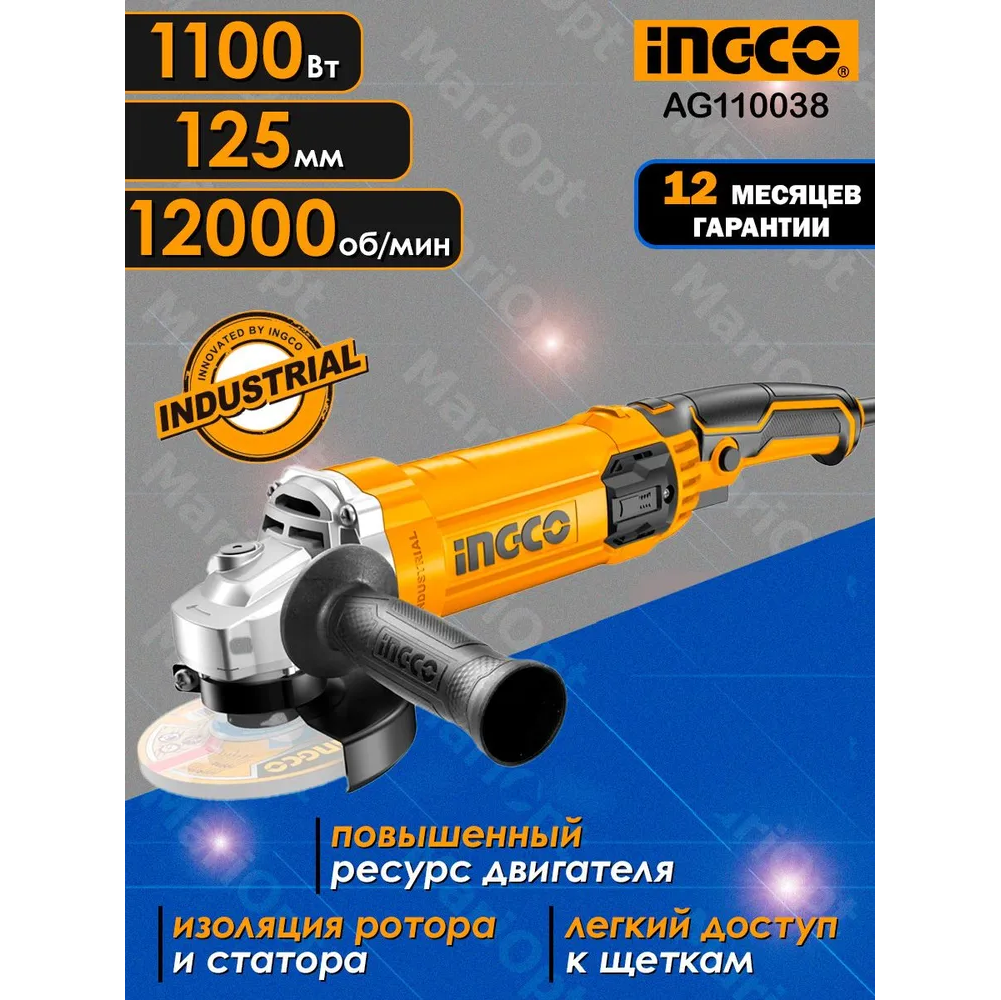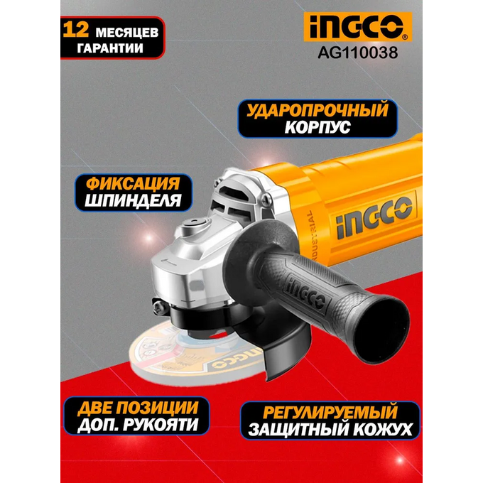 Угловая шлифовальная машина (УШМ) INGCO AG110038 INDUSTRIAL применяется для резки, шлифовки материалов и работ по бетону сухим способом. Эта мощная, но в то же время достаточно легкая и удобная в эксплуатации модель станет незаменимым помощником как для любителей так и профессионалов. Угловая шлифовальная машина оборудована алюминиевым корпусом, обеспечивающий эффективный отвод тепла при нагрузках и обеспечивает длительный срок службы инструмента. Блокировка шпинделя позволяет проводить простую смену оснастки.