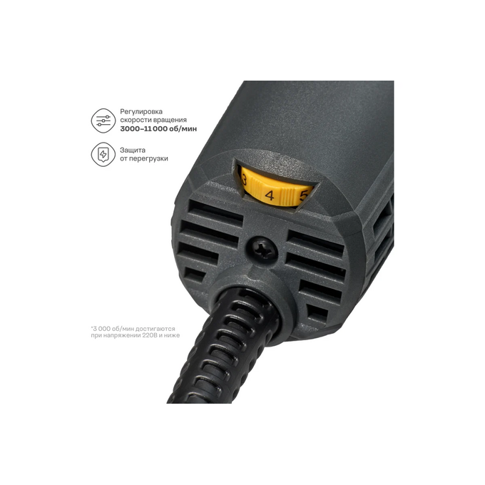 Константная электроника с обратной связью по току обеспечивает поддержку оборотов под нагрузкой, плавный пуск и защиту инструмента от перегрузки. Регулятор оборотов позволяет выбирать скорость вращения диска, которая подойдёт для нужного вида работ. Лаковое покрытие надежно защищает ротор и статор.
