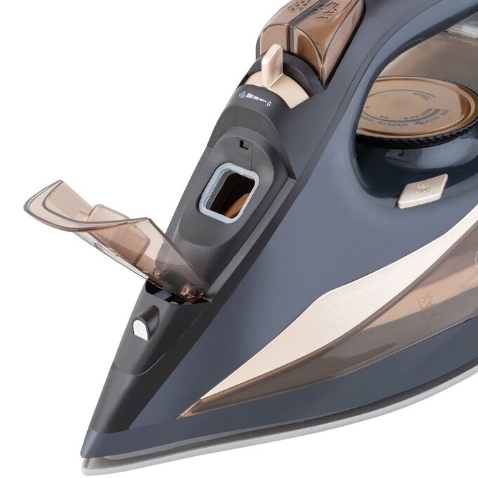 Сверхпрочная поверхность подошвы из керамики, Функция вертикального отпаривания, Сухой и влажный режим глажения, Мелкодисперсное разбрызгивание, Индикация уровня воды, Регулировка температуры, Система защиты от накипи, Функция антикапля, Функция автоотключения, Функция самоочистки