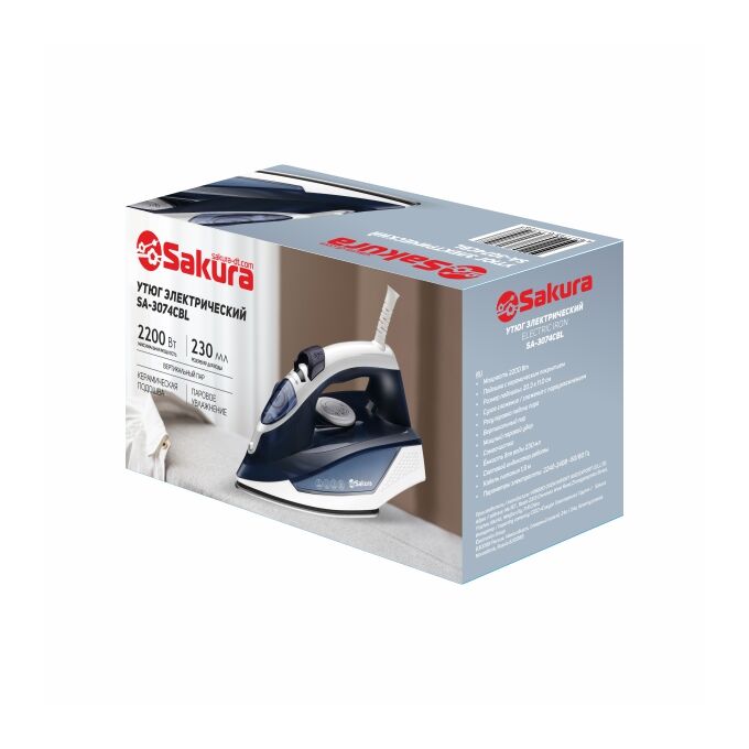 Утюг. Мощность 2200 Вт, резервуар д/воды 230 мл, подошва керамика (203х110 мм), регулируемый термостат, распылитель воды, регулятор интенсивности пара, вертикальное отпаривание, паровой удар, автоочистка, мерный стакан, общая длина шнура питания 1,9 м