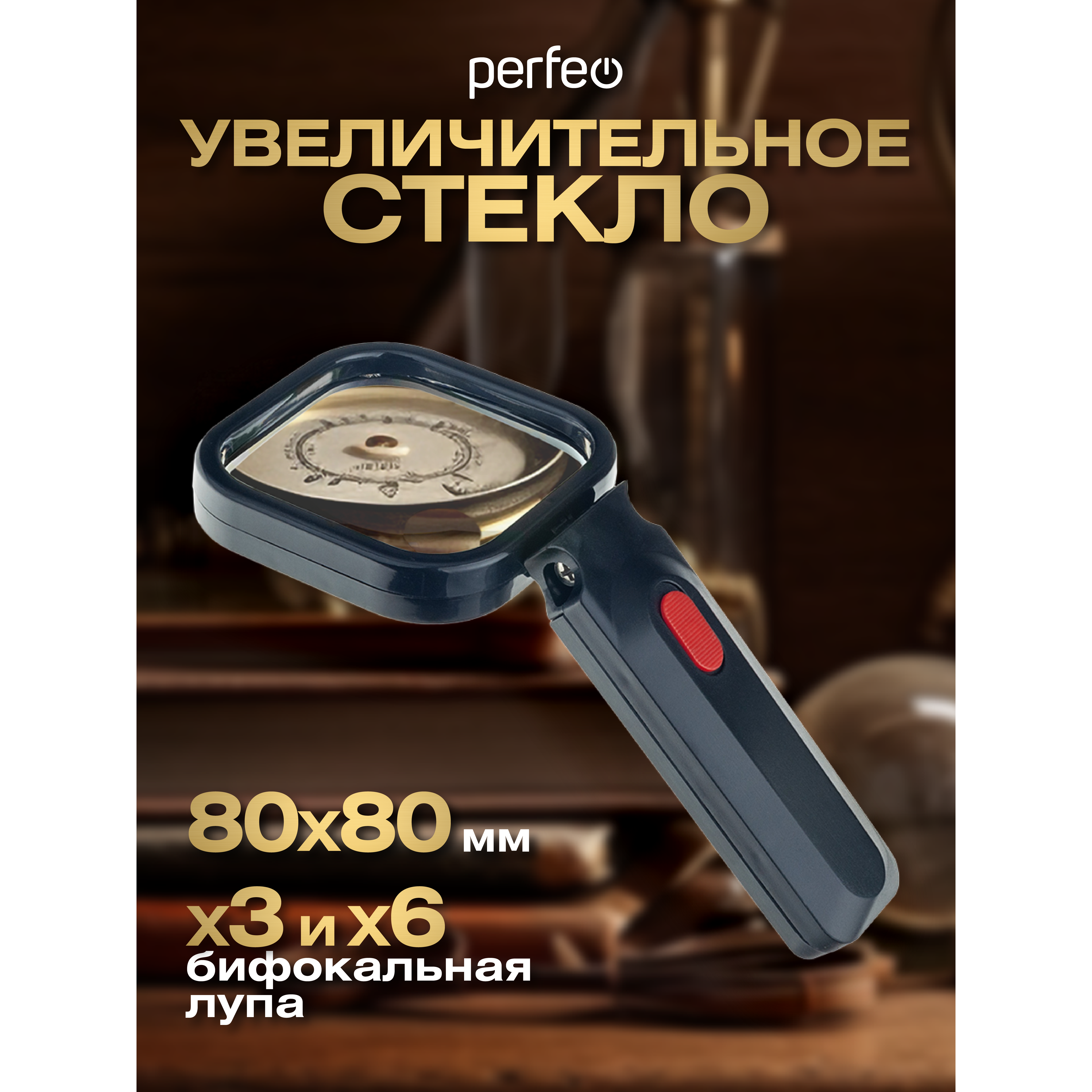 Увеличительное стекло (Лупа) Perfeo PF-ZM8080чёрный, бифокальная 3х,6х, 80х80 мм, подсветка, пластик, (Арт. PF_D0116)