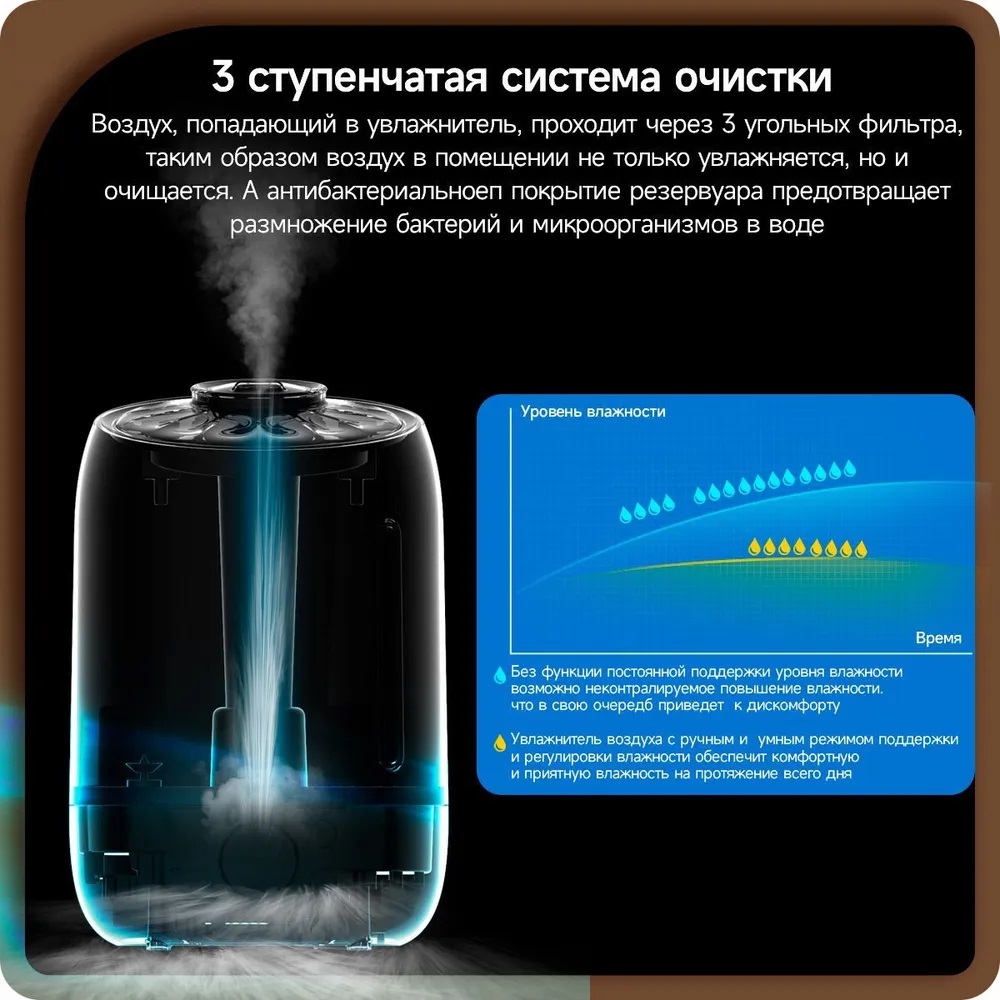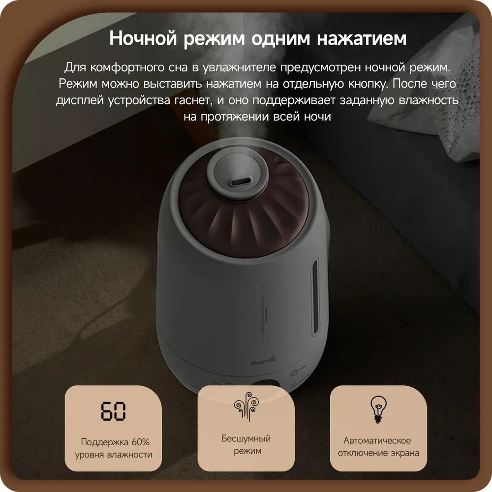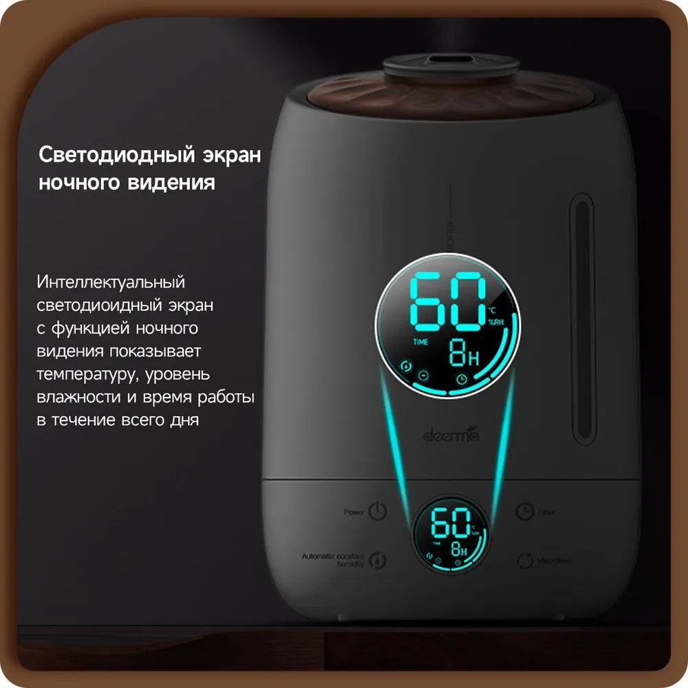 Встроенный LED-дисплей, Ароматизация воздуха, 12 часов увлажнения от одной заправки, 3 режима интенсивности испарения, ночной режим с минимальным уровнем шума