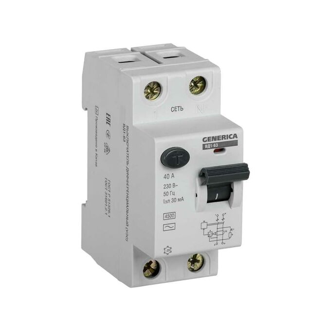 Технические характеристики GENERICA УЗО ВД1-63 2Р 40А 30мА MDV15-2-040-030