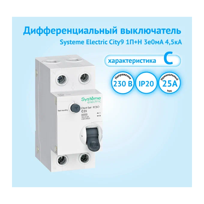 УЗО Systeme electric City9 Set C9D34640 1P+N С 40А 4.5kA 30мА Тип-АС 230В