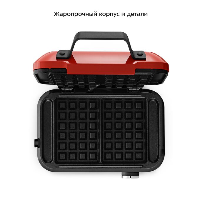 Электрическая вафельница имеет корпус, выполненный из прочного термоустойчивого пластика. В вафельнице установлены нагреватели в каждой половине. Прорезиненные ножки не дают прибору скользить по столу во время готовки.