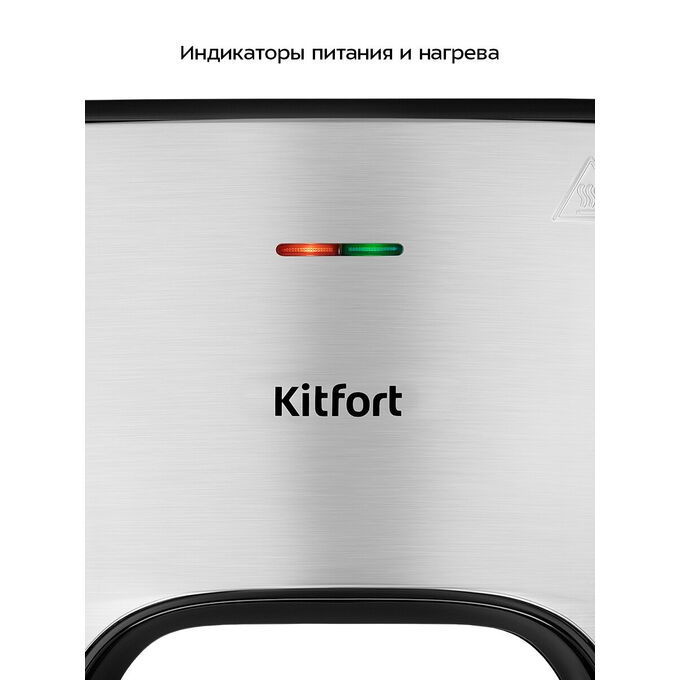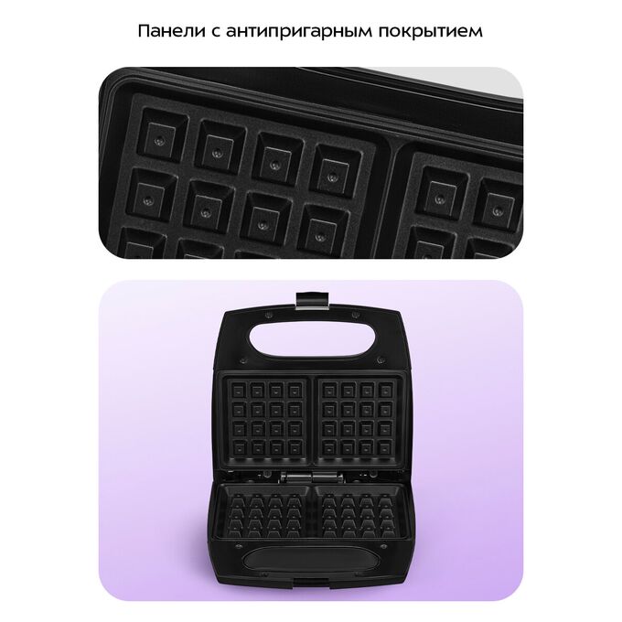 Вафельница оснащена индикаторами питания и нагрева, а также термостатом для поддержания температуры панелей.